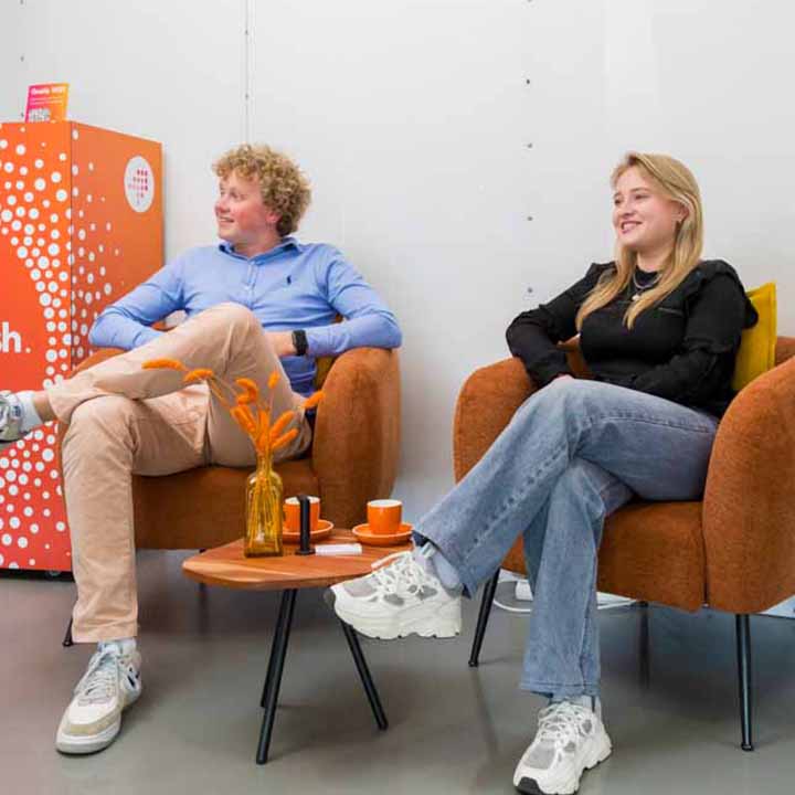 Vanaf de bovenste verdieping aan de rand van de stad IJsselstein met uitzicht over de jachtvelden. Daar werk je dan, samen met super gezellige collega’s, genietend van het groene plaatje. Er moet ook gewerkt worden, maar ontspanning op het werk houdt de motivatie sterk!